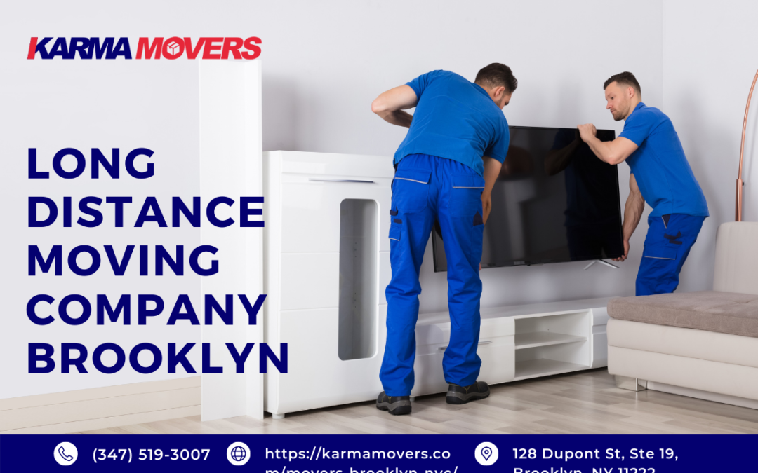 Two professional movers in blue uniforms carefully lifting a television during a move, representing Karma Movers, a long-distance moving company based in Brooklyn.