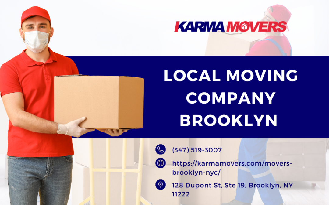 A professional mover in a red uniform and face mask holds a cardboard box, representing Karma Movers, a local moving company in Brooklyn. Contact information and website details are displayed prominently.